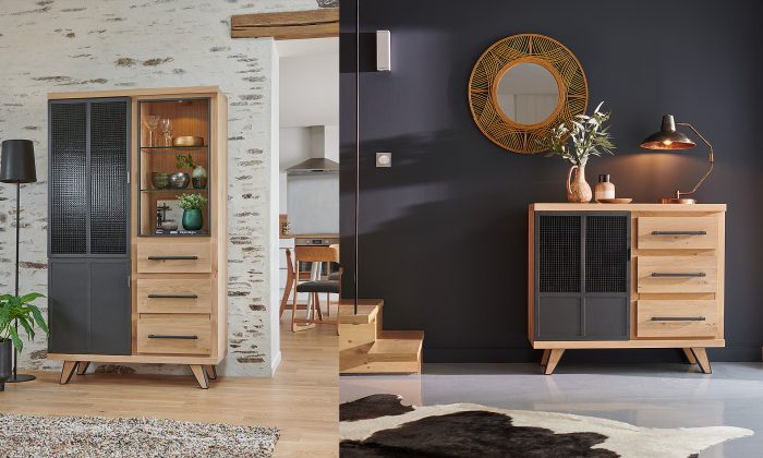 Meubles dessus, façades, côtés, fonds chêne massif à nœuds. Étagères, derrière, séparation panneau de particules placage chêne. Cadre côté métal. Pieds métal et chêne massif. Portes battantes chêne massif. Portes battantes métal et verre armé. Tiroir chêne massif sur coulisses invisibles avec amortisseurs. Tablette verre épaisseur 8mm. Option spot éclairage chaud.