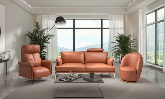 Photo d'un salon avec un canapé et un fauteuil. La finition est cuir et le piétement en bois.