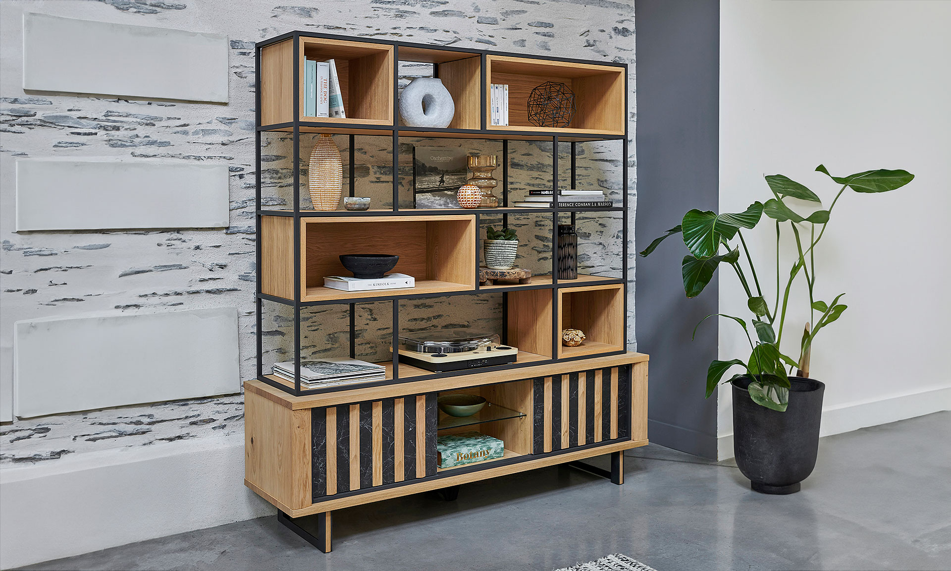 Meubles dessus, côtés, façades, derrières, séparations, fonds et tablettes panneaux de particules revêtus de chêne. Portes bois panneaux de fibres moyenne densité revêtus de placage chêne et poignée bois massif laquée incrustée. Portes céramique marbrée et montant moulurés chêne massif. Pieds métal gris anthracite finition poudre incrustation chêne.