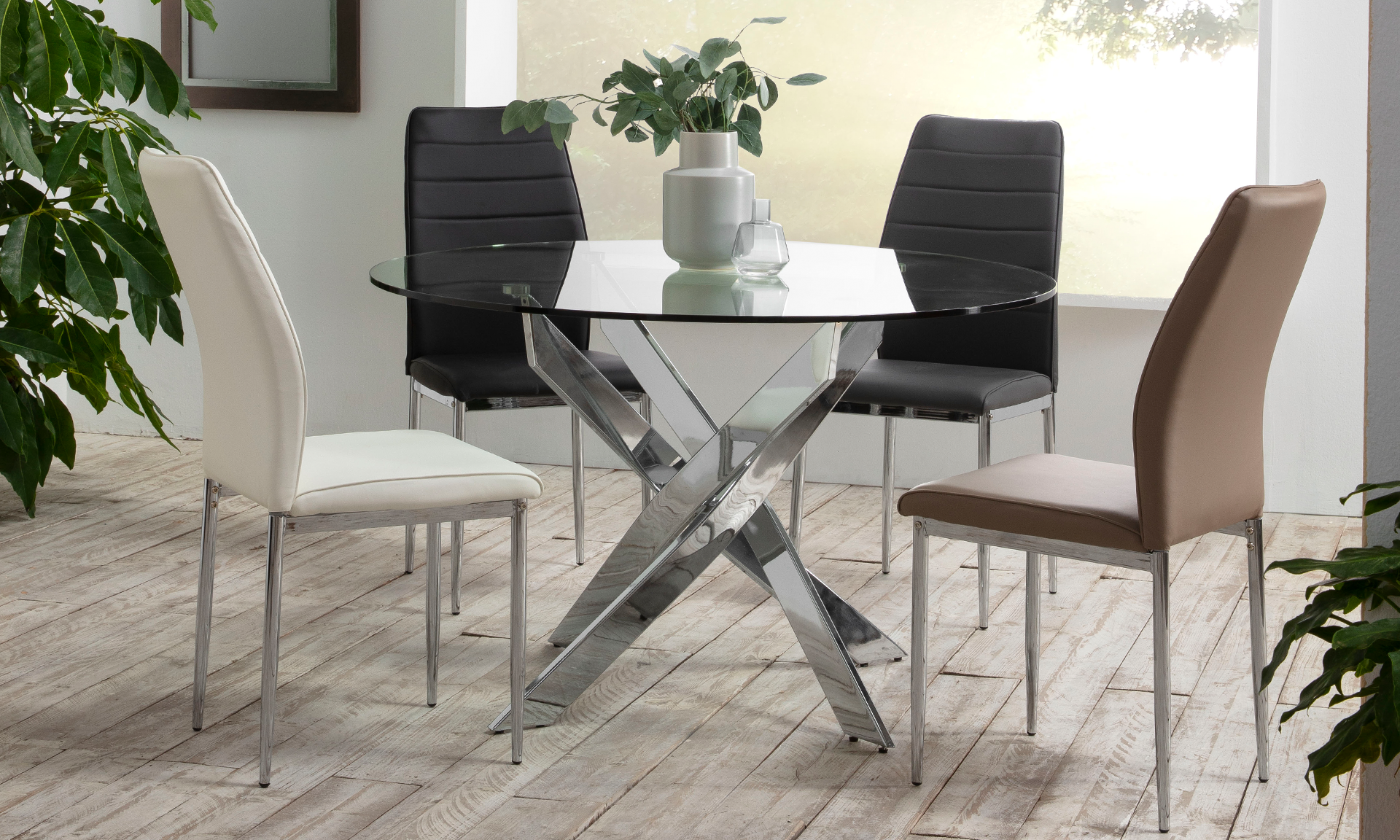 Table plateau rond en verre. Pied métal chromé.