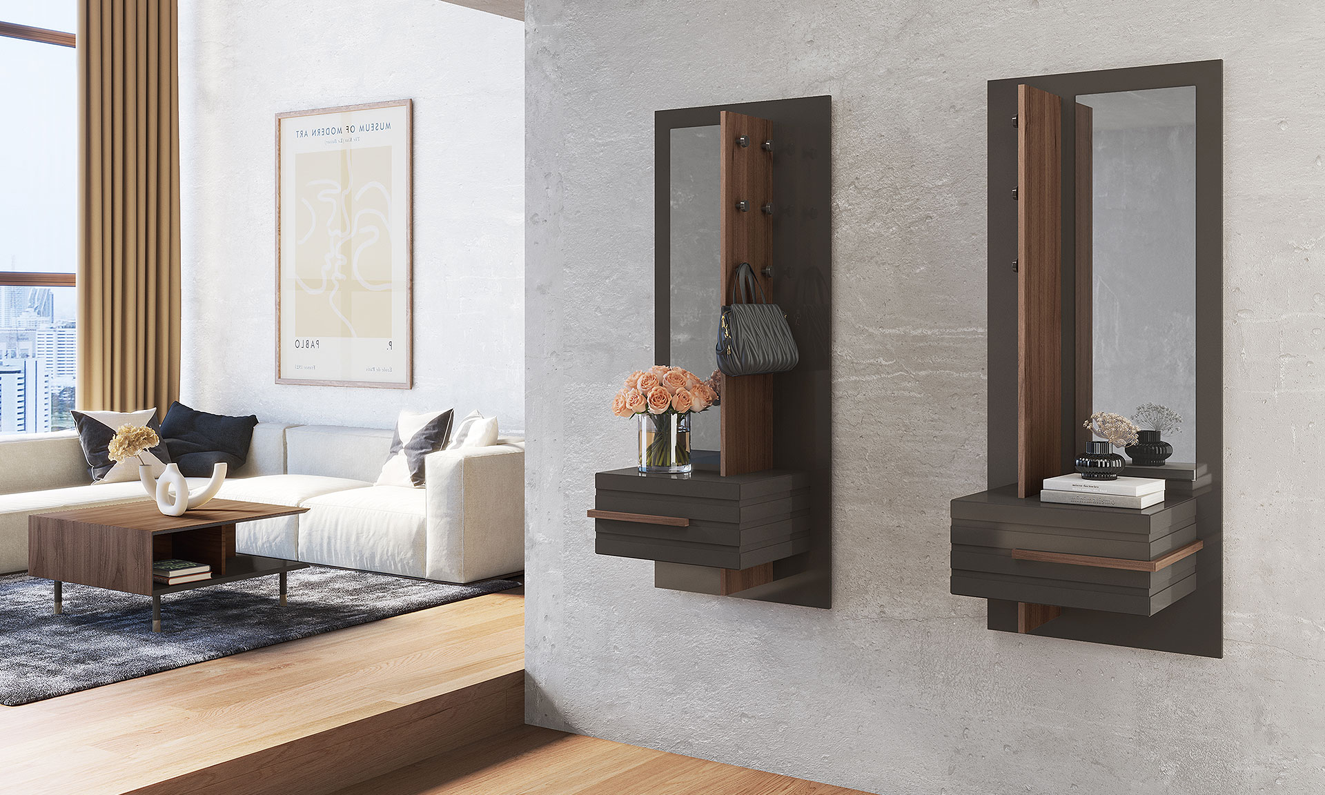 Intérieur, extérieur, dos, portes, pieds, plateau, fonds et intérieur de tiroir, niche en MDF laqué. Charnières et coulisses invisibles.